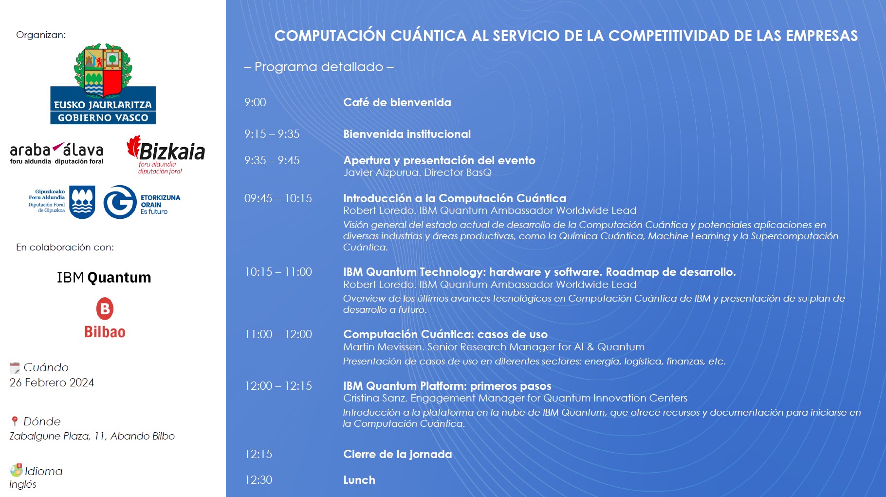 February 09, 2024The Department of Education of the Basque Government, together with the Provincial Councils of Araba, Bizkaia and Gipuzkoa and in collaboration with IBM and Bilbao Ekintza, plans to organize a groundbreaking event dedicated to Quantum Computing as a catalyst for Business Competitiveness.